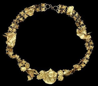 | Hellenistic Gold 3rd-2nd Century BC Composed of two rows of minute die-struck four-petaled and eight-petaled rosettes the central element decorated in repouseé with the head of Alexander the Great |